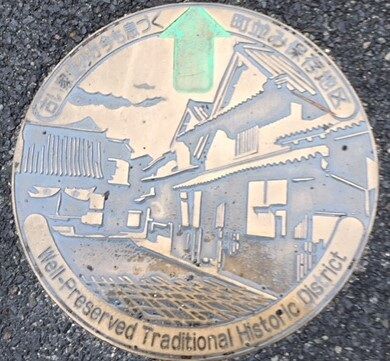 旧吉舎町の蓋で沢山の町章と町の花梅がデザインされています。吉舎町三玉633辺りの路上に有りました。