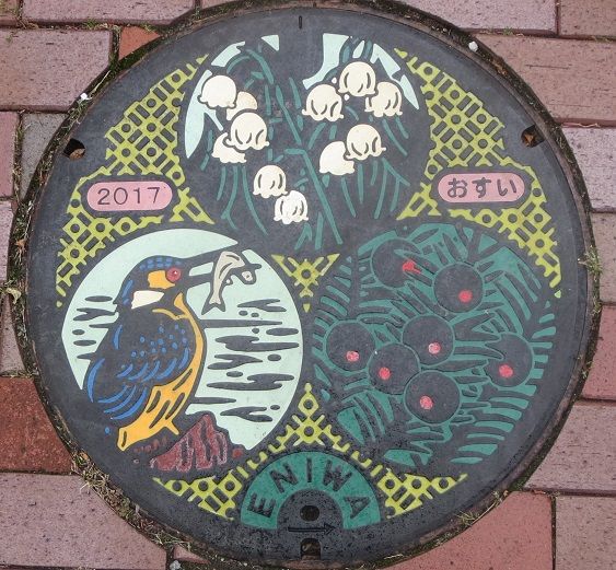 市制50周年記念事業で設置された蓋で、アルパカとハロウィンカボチャ、アスパラ、菊がデザインされています。JR千歳線恵み野駅西口の道路沿いの歩道に有りました。