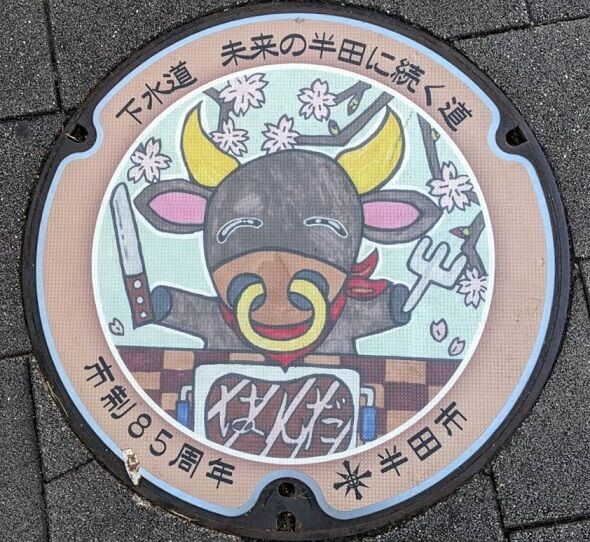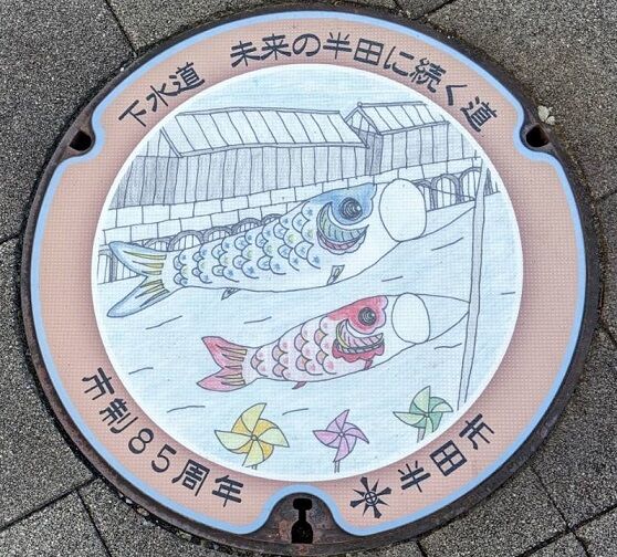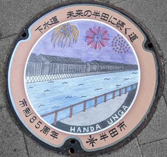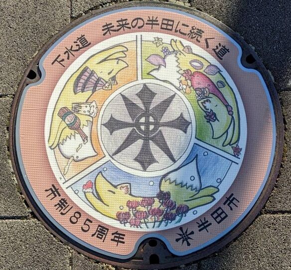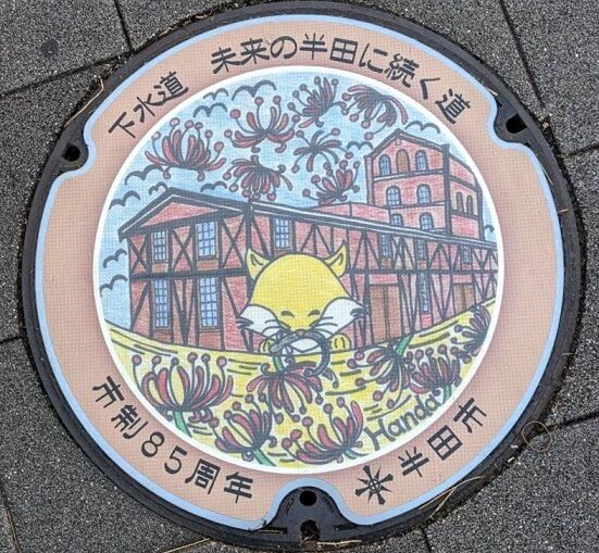 半田市のマンホールの蓋 2019年11月16日 今回は半田市の蓋を紹介します。市章と市の花皐月、市の木黒松がデザインされています。榎下町8に在る「カフェブリック」の南東角のレンタサイクル置き場の傍に有りました。市章と沢山のミズスマシがデザインされています。名鉄河和線知多半田駅東口に在るクラシティビル内の「知多信用金庫駅前支店」横の壁際に有りました。次の2枚の蓋と共に名鉄河和線知多半田駅東口の歩道に有りました。次の2枚の蓋と共に前の蓋の東向い側の歩道に有りました。次の3枚の蓋と共に「クラシティ半田」の前の駅側の歩道に有りました。続きます。 タグ :##半田市のマンホール##愛知県のマンホール