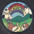 展示用の蓋で蛙の雨宿りがデザインされていますが、町との関連性は不明で調査中です。町内には無彩色のものが設置されています。役場に有りました。