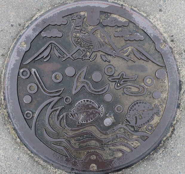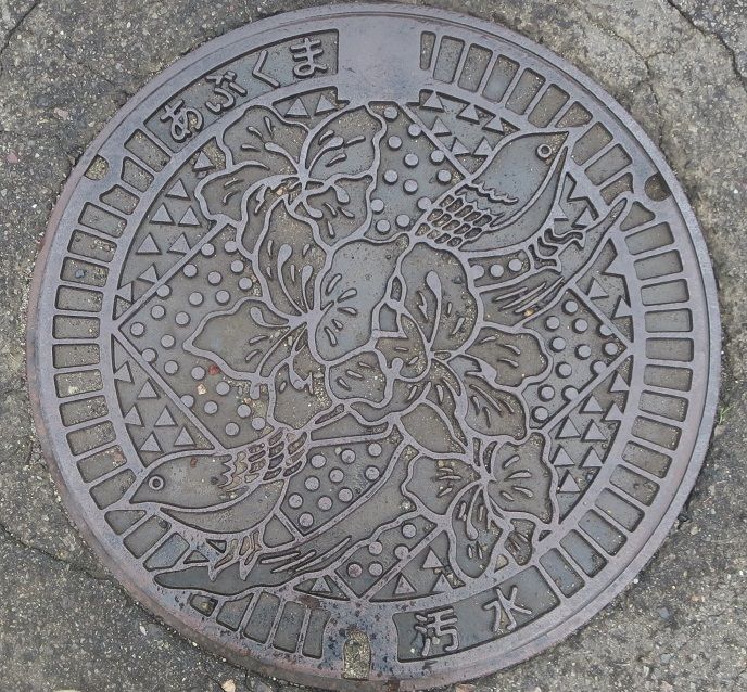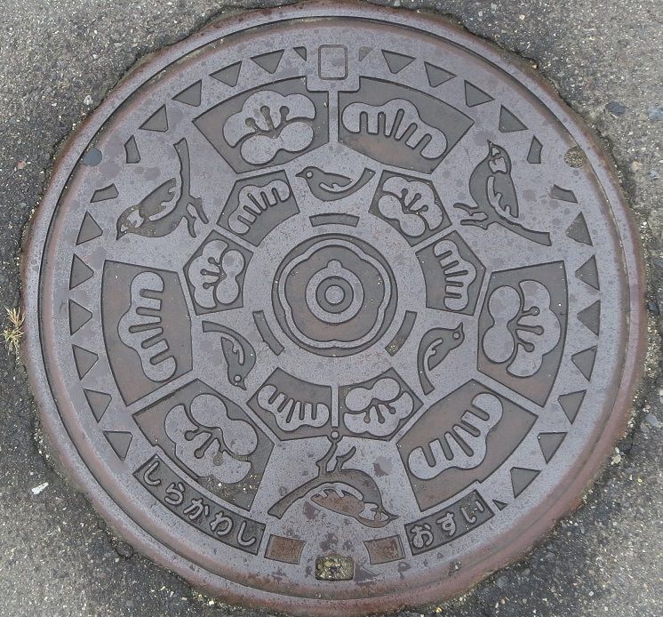 旧白河市の蓋で市章と市の花梅、市の木赤松市の鳥ホオジロがデザインされています。小田川郵便局の近くに有りました。