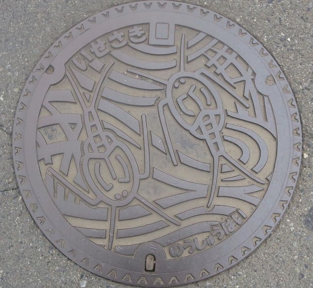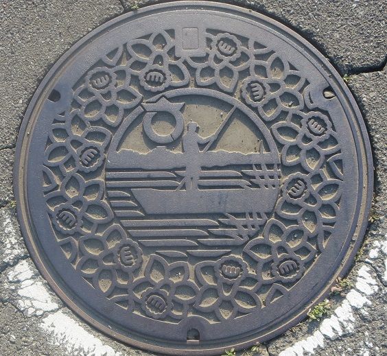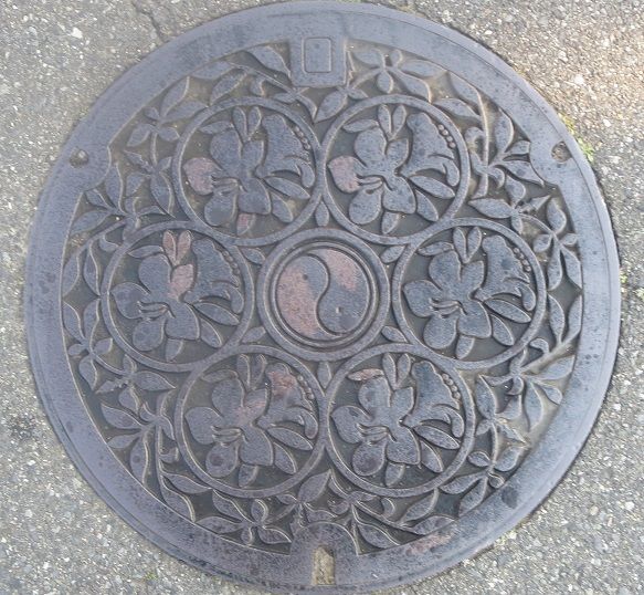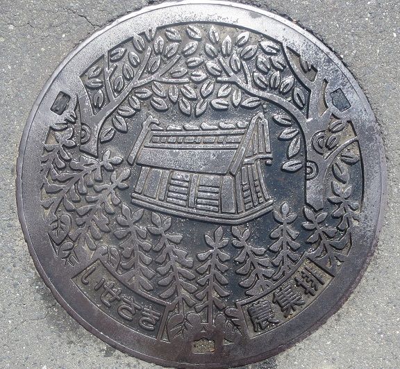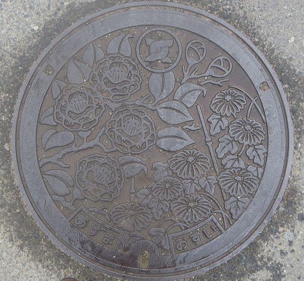 旧東村の蓋で村章と図案化された菊がデザインされています。