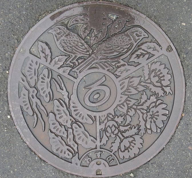 旧東村の蓋で村の花躑躅と村の鳥鴬がデザインされています。