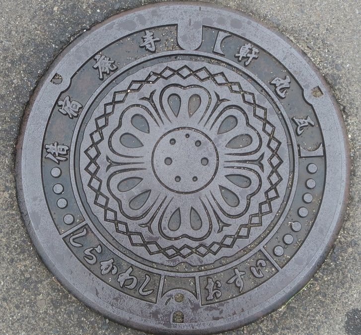 旧白河市の蓋で奈良時代の遺跡「借宿廃寺跡」から出土した「複弁六葉蓮華文軒丸瓦」がデザインされています。五箇小学校の近くに有りました。