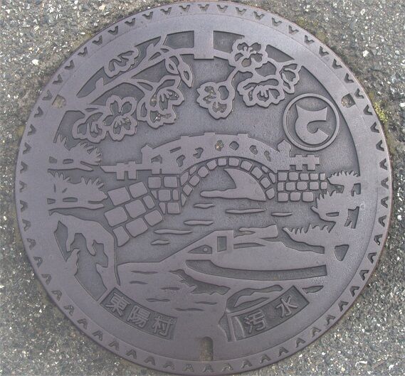 次の蓋と共に旧東陽村の蓋で村章と村の花「永安寺桜」、村の木松、石橋がデザインされています。村は「石工の里」として有名で、石工職人が全国の有名な石橋を数多く築いてきたそうです。東陽町南に在る「黒田酒店」の前の路上に有りました。