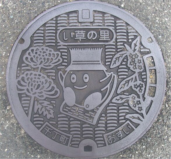 旧千丁町の蓋で町の花菊と町の木木星、「い草の里」のマスコットキャラクター「いぐさくん」、畳表がデザインされています。鹿児島本線千丁駅への入口の路上に有りました。