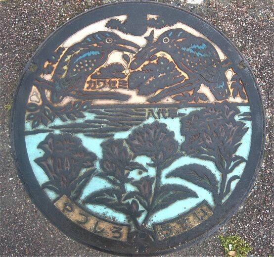 市の花ヤツシロソウと市の鳥カワセミがデザインされています。萩原町2-10-10の歩道に有りました。