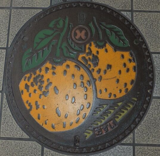 市章と特産品の「晩白柚(ばんぺいゆ)」がデザインされています。「晩白柚」は世界最大の柑橘です。松江城町2-26の歩道に有りました。