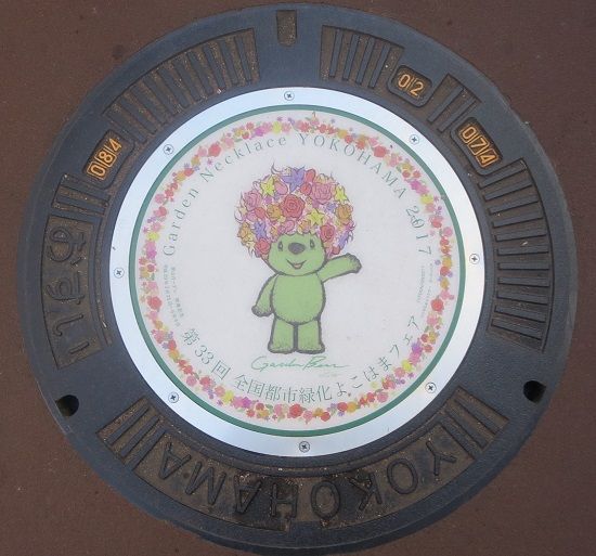 「第33回全国都市緑化よこはまフェア」開催の記念蓋でマスコットキャラクター「GARDEN BEAR」がデザインされています。「bear」は「熊」の意味の他に「花をつける」、「実を結ぶ」という意味があるそうです。相模鉄道本線鶴ヶ峰駅の近くに有りました。
