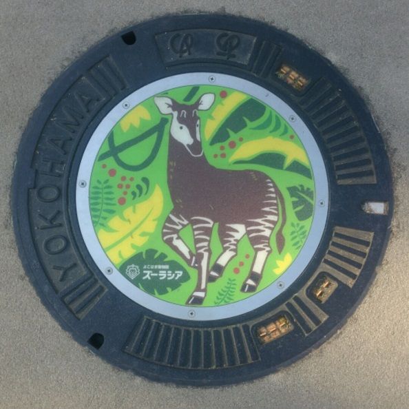 よこはま動物園ズーラシアの蓋でオカピがデザインされています。