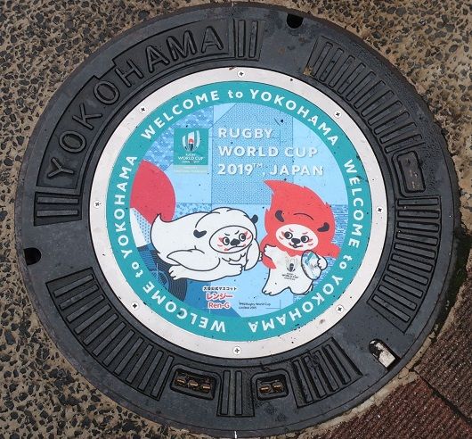 「ラグビーワールドカップ2019」開催記念の蓋が市営地下鉄新横浜駅から日産スタジアムの間に設置されました。日産スタジアムでは決勝、準決勝2試合を含めて7試合が行われます。新横浜2丁目の新横浜中央通りとアリーナ通りに沢山有りました。