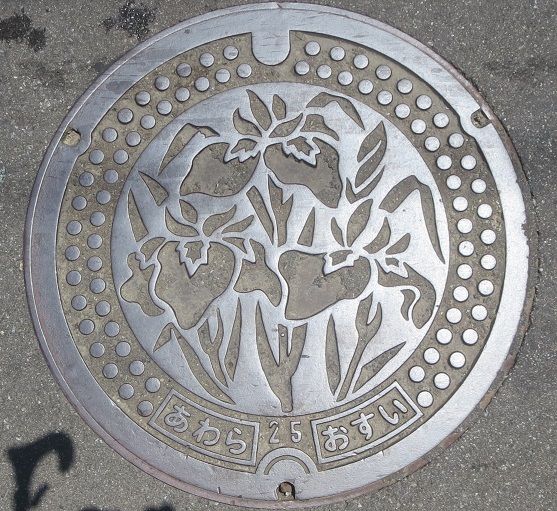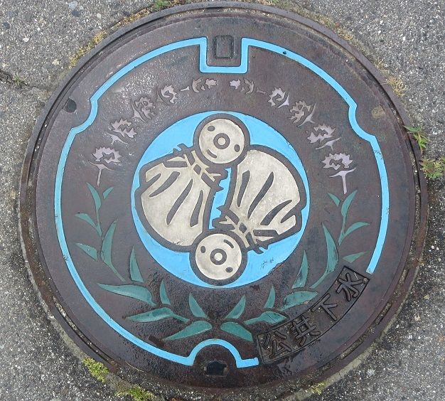 町名とブドウがデザインされています。駅前通りの歩道に有りました。