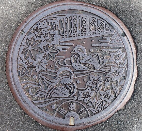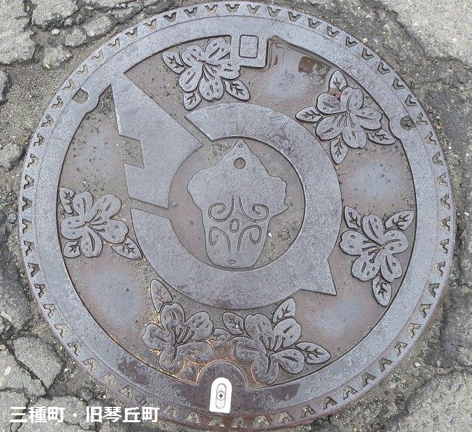 旧琴丘町の蓋で町章の中に「アシカ型の土笛」と町の花ヤマツツジがデザインされています。「アシカ型の土笛」はあしかを狩っていた縄文人の海獣型の土製品で全国でも珍しいそうです。