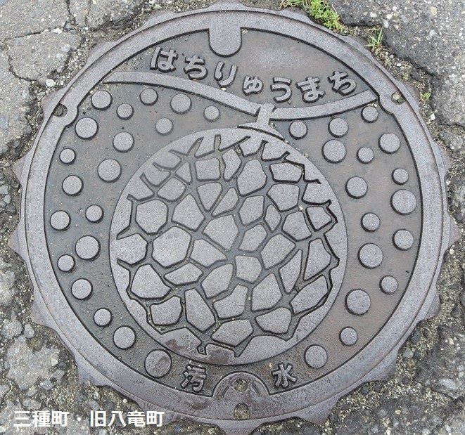 旧八竜町の蓋で特産品の「八竜メロン」がデザインされています。