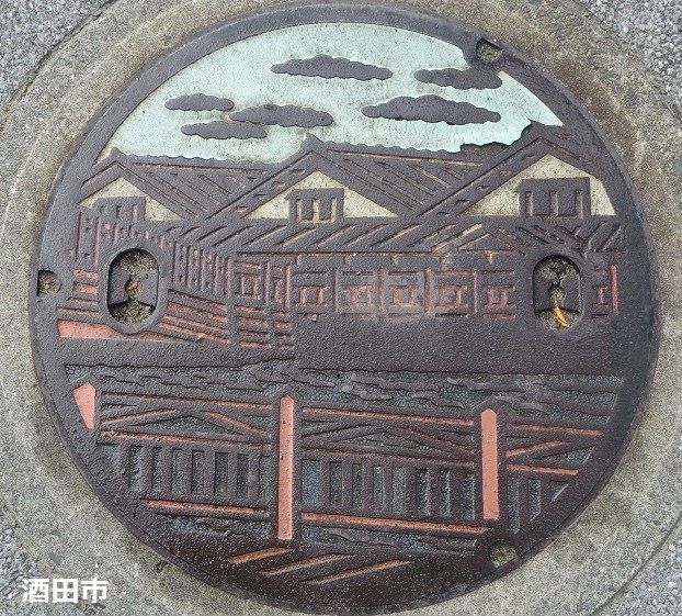 山居倉庫と新井田川を往来する旧市章入りの「千石船」がデザインされています。本町3丁目に有りました。
