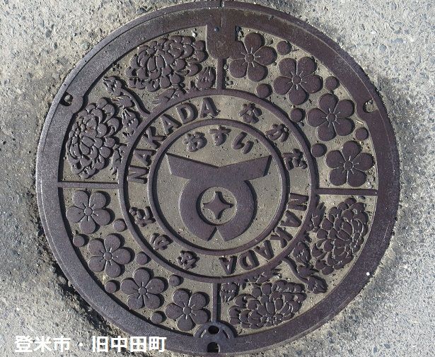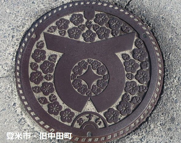 旧中田町の蓋で町章と菊、町の木梅がデザインされています。