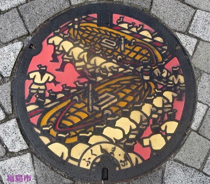 奥州三名湯の一つに数えられる飯坂温泉の蓋です。日本最古と言われている共同浴場「鯖湖湯」と福島県の代表果物のリンゴ、桃、サクランボ、梨がデザインされています。