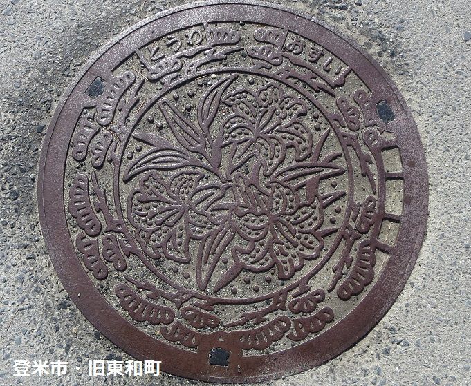 旧東和町の蓋で町の花山百合と町の木赤松がデザインされています。