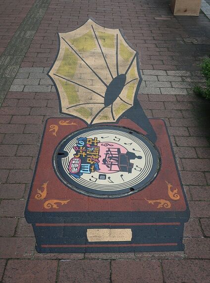 前の蓋をレコードに見立てたトリックアートが「秋田銀行福島支店」の横の歩道に有りました。