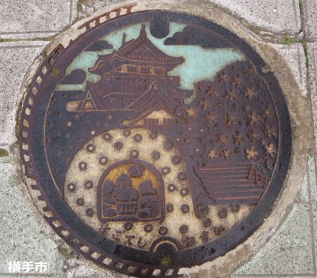 旧鳴子町の蓋で名産のこけしがデザインされています。