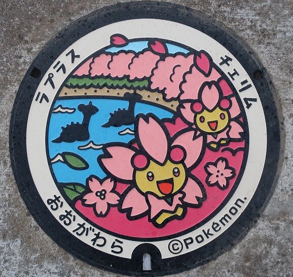 町の観光PRキャラクター「常のモロ」と「川内ホタル」がデザインされています。次の蓋と共に「道の駅 おおさと」の「おおさと食堂」の前に有りました。