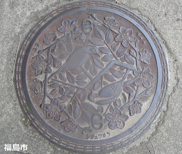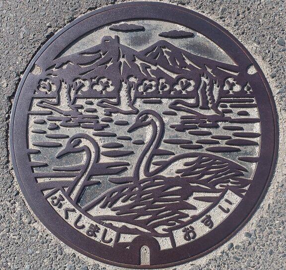 岡部地区の蓋でこの辺りの阿武隈川は白鳥の飛来地であることから白鳥がデザインされています。山口文知摺前1に有りました。