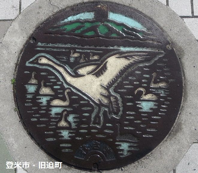 旧迫町の蓋で伊豆沼で羽を休める町の鳥白鳥がデザインされています。左沼萩洗2丁目に有りました。