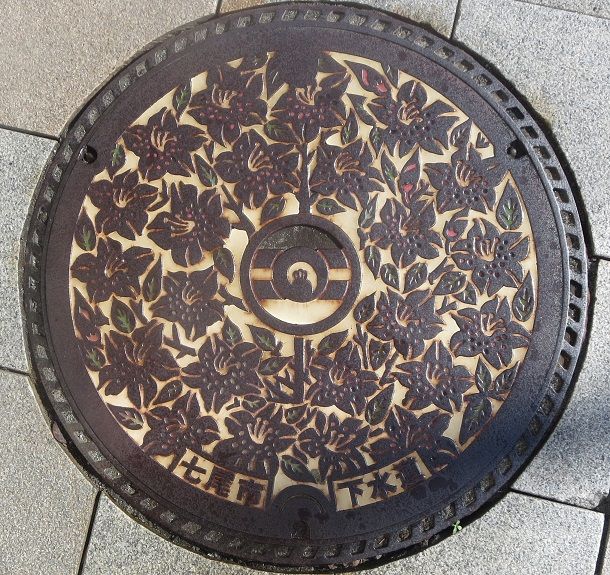 旧七尾市の蓋で市章と市の花躑躅がデザインされています。和倉町湯元の広場に有りました。