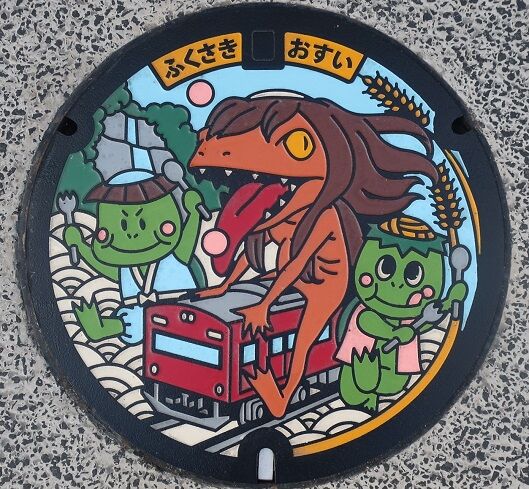 福崎町のマンホールの蓋 2021年03月09日 今回は福崎町の蓋を紹介します。町のマスコットキャラクター「フクちゃんサキちゃん」と「ガジロウ」、JR播但線の電車、「七種の滝」、特産品の「もちむぎ」がデザインされています。「フクちゃんサキちゃん」と「ガジロウ」は当町出身の民俗学者・柳田國男の著書に登場する妖怪だそうです。JR播但線福崎駅の降車場に有りました。町の花サルビアと町の木クロガネモチ、市川がデザインされています。西田原1633の路上に有りました。サルビアとクロガネモチがデザインされています。南田原179の路上に有りました。続きます。 タグ :##福崎町のマンホール##兵庫県のマンホール