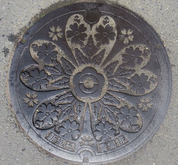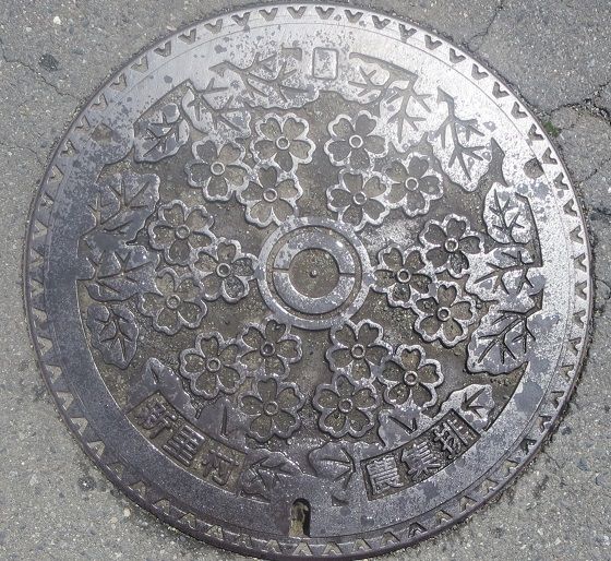 この蓋も含めて以下の蓋は旧新里村の蓋です。村章と村の花桜草がデザインされています。