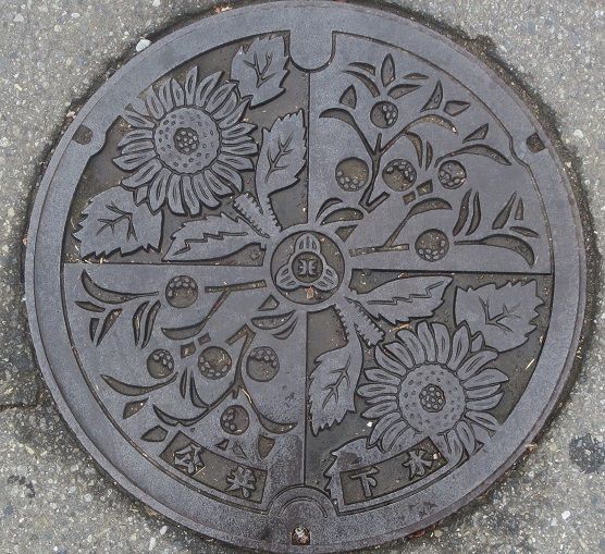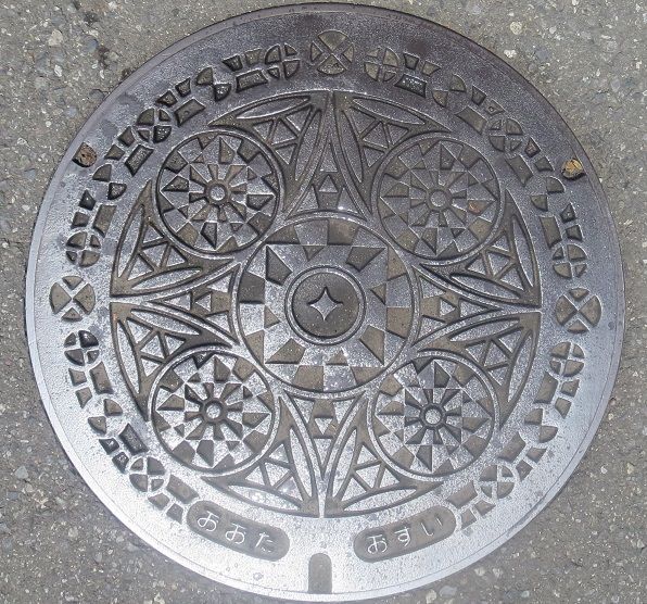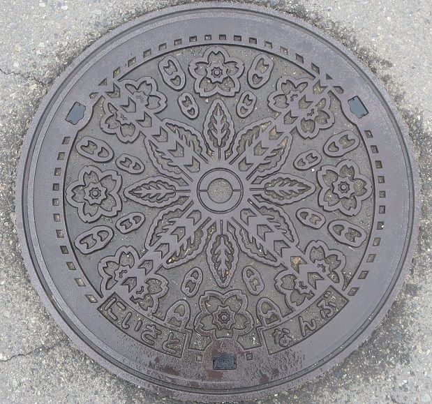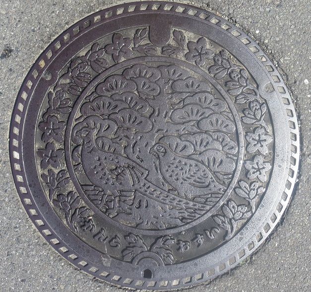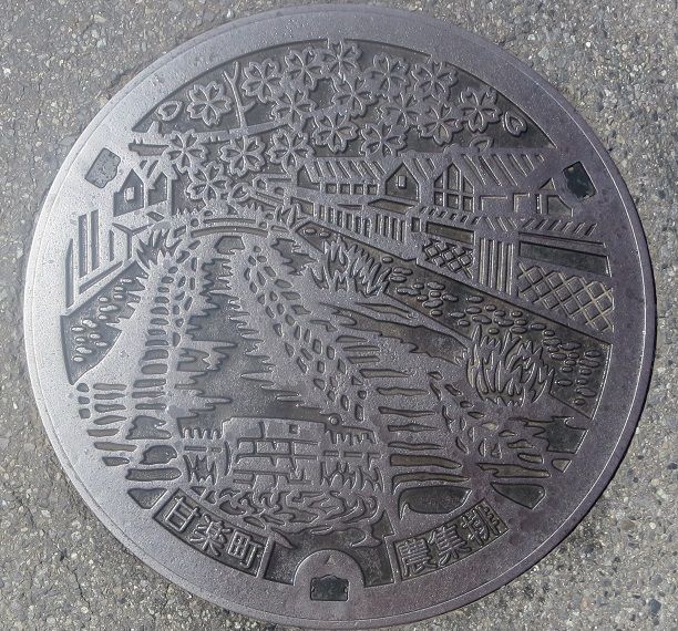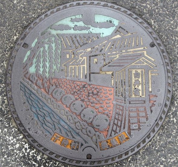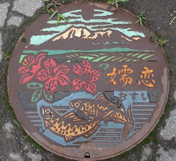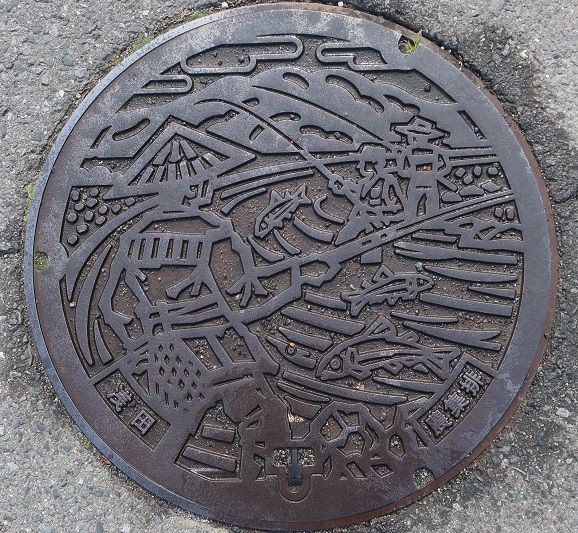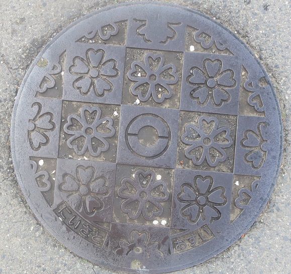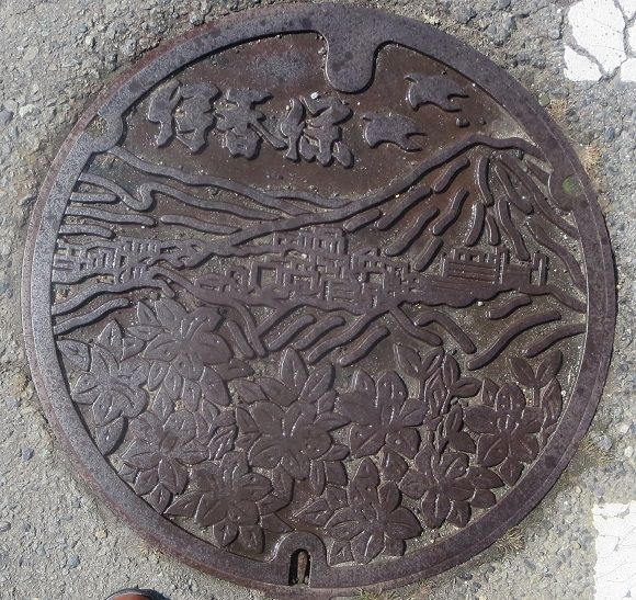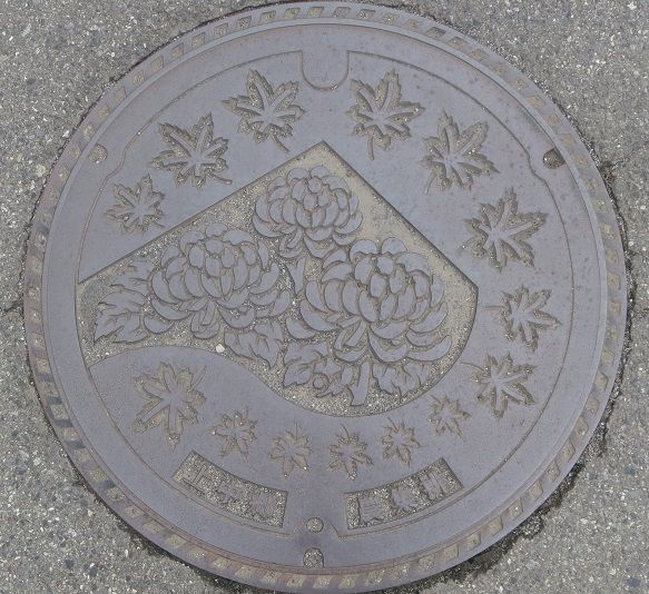町章と躑躅、町の木モミジ、町の鳥不如帰がデザインされています。前の蓋の近くの川沿いの道に有りました。