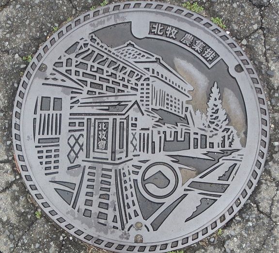 上毛三山と田園風景、稲穂、麦穂、魚がデザインされています。菊池町に在る北部水処理センターの前の路上に有りました。