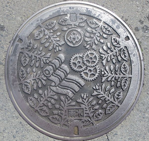 市制施行100周年記念の蓋で市章と100周年の礎となった絹物産業の「桐生絹物」のシンボル的建築物「ノコギリ屋根工場」、「白瀧姫」、「襲色目の美(かさねいろめのび)」の文様がデザインされています。「襲色目の美」は平安時代に始った女性の重ね着の配色美のことだそうです。JR両毛線桐生駅南口の出入口に有りました。
