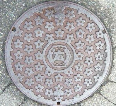 旧小出町の蓋で町章と桔梗、コブシの花がデザインされています。浦町1-1に有りました。