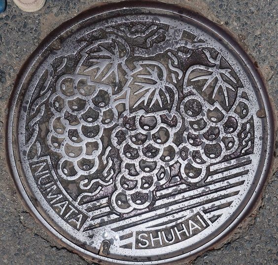旧東部町の蓋で町の花レンゲツツジと特産品の葡萄がデザインされています。滋野乙のR79沿いに在るローソンの近くに有りました。