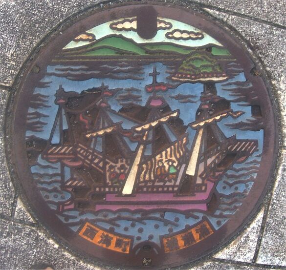 西海市のマンホールの蓋 2024年04月30日 今回は西海市の蓋を紹介します。西海橋公園の桜と西海橋、渦潮がデザインされています。大瀬戸町瀬戸板浦郷841辺りの路上に有りました。次の蓋と共に旧西海町の蓋で特産品の蜜柑がデザインされています。横瀬駐在所の近くの路上に有りました。「南蛮船」がデザインされています。横瀬浦は南蛮貿易港として開港されたそうです。「Aコープ横瀬」の向い側の歩道に有りました。旧西彼(せいひ)町の蓋で町の花チューリップがデザインされています。八木原郷2018-7辺りの路上に有りました。旧大瀬戸町の蓋で町の花水仙がデザインされています。大瀬戸町多比良内郷1694辺りの路上に有りました。続きます。 タグ :##西海市のマンホール##西海町のマンホール##西彼町のマンホール##大瀬戸町##長崎県のマンホール