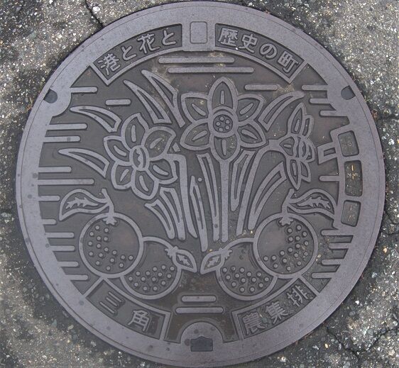旧三角町の蓋で町の花水仙と特産品の蜜柑がデザインされています。三角町波多4241-1の踏切を渡った路上に有りました。