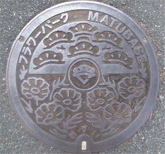 旧松橋(まつばせ)町の蓋で町章と町の花秋桜、町の木松がデザインされています。松橋町曲野28辺りの路上に有りました。