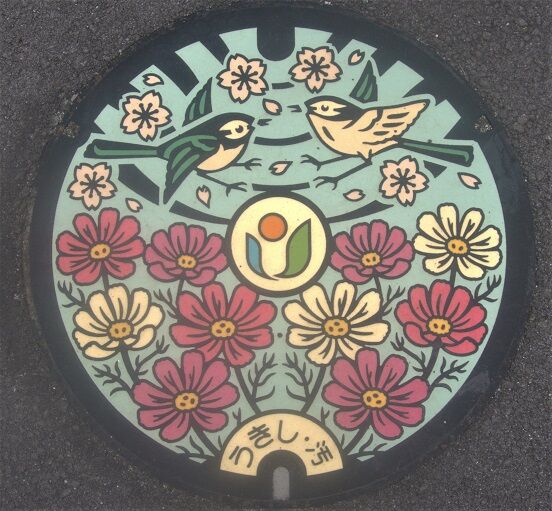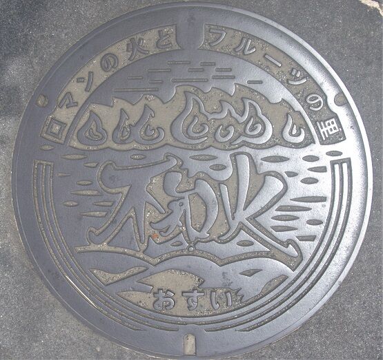 旧不知火町の蓋で八代海に発生する蜃気楼と町名がデザインされています。不知火町高良2153の鳥居の傍に有りました。