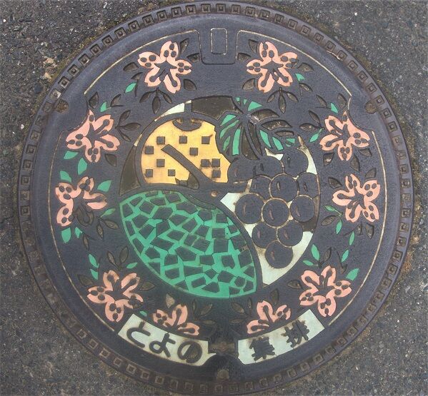 次の蓋と共に旧豊野町の蓋で町の花躑躅と特産品のメロンと葡萄がデザインされています。豊野町安見805の路上に有りました。