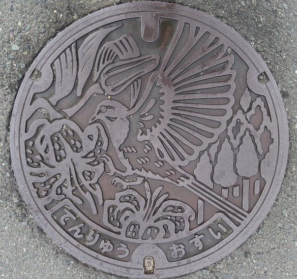旧天竜市の蓋で市の花山百合と市の木杉、市の鳥キセキレイがデザインされています。