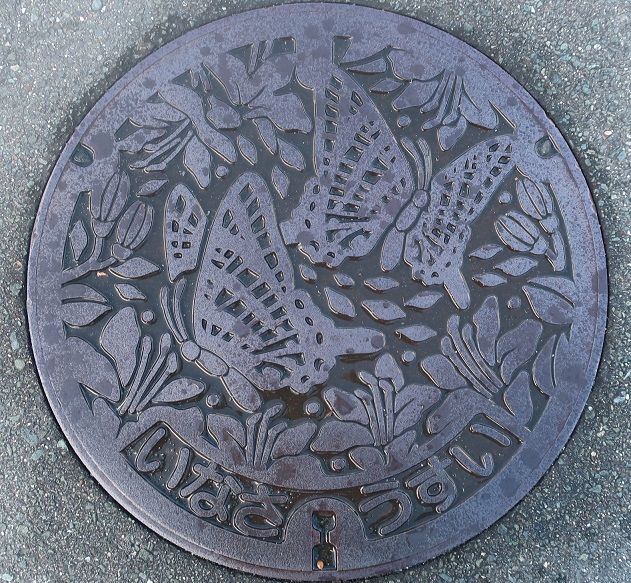 旧引佐町の蓋で渋川つつじとギフチョウが2匹デザインされています。北区神宮寺町15に有りました。