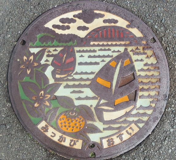 旧三ヶ日町の蓋で町の花ミカンの花とその実、浜名湖に浮ぶヨット、浜名湖に架かる瀬戸橋がデザインされています。三ケ日協働センターに有りました。