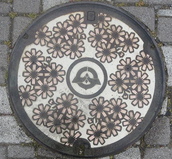 旧長沼町の蓋で町の花百合と町の鳥カッコウ、町の木桜がデザインされています。R118沿いの北側の歩道で上臼ケ堂の小さなT字路の電柱の袂に有りました。