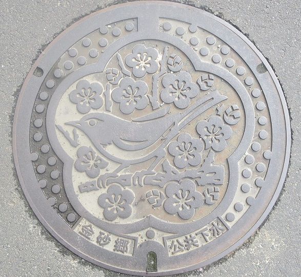 旧金砂郷町の蓋で町の花梅と町の鳥鶯がデザインされています。