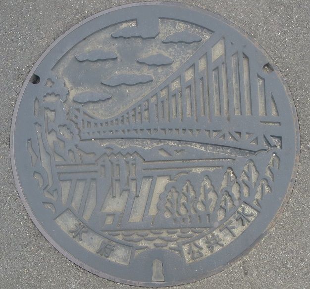旧水府村の蓋で竜神ダムと竜神大吊橋、村の木杉がデザインされています。
