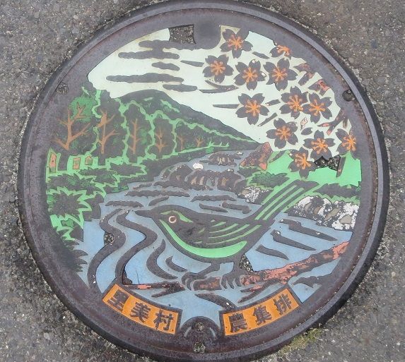 旧里美村の蓋で村の花山桜と村の鳥鶯、村を流れる里川の風景がデザインされています。市役所里美支所前の路上に有りました。