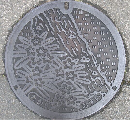 次の蓋と共に旧飯森町の蓋で町の花秋桜と町の木椿の花がデザインされています。2枚共「田結浄化センター」の敷地内に有りました。