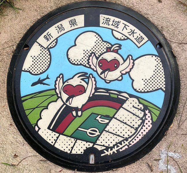 新潟県のマンホールの蓋 2019年02月05日 今回は新潟県の蓋を紹介します。 流域下水道の蓋で、国際保護鳥のトキをモデルにしたキャラクター「トッキッキ」が新潟県のサッカーの聖地「デンカビッグスワンスタジアム」に降り立つ姿と飛行機がデザインされています。東区海老ケ瀬65に在る小さな公園の中に有りました。 上越市に在る南部工業団地の蓋で上越市の花椿と市の木桜の花、旧頚城村の花菖蒲がデザインされています。 新潟県の蓋の紹介は今回で終りです。 次回から静岡県の蓋を紹介します。 続きます。 タグ :#写真