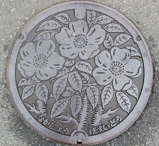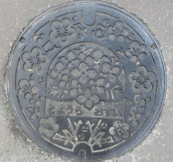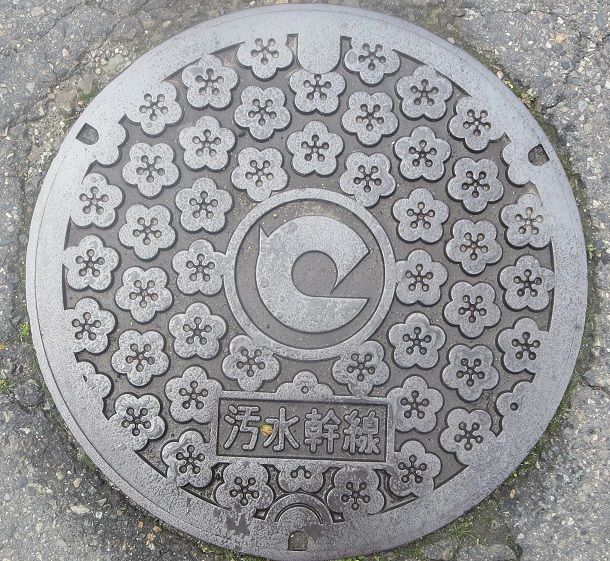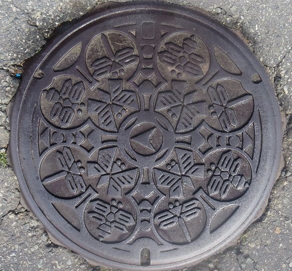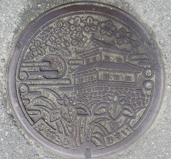 旧豊浦町の蓋で町の花梅の花と町の木紫陽花がデザインされています。左下の花弁の中は市章に替ってます。